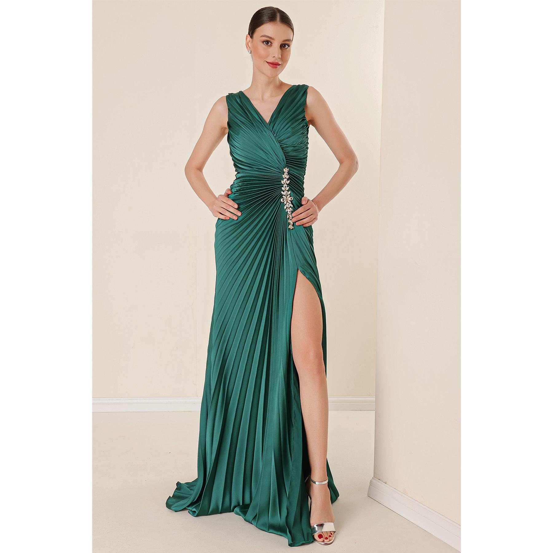 Длинное плиссированное платье с V-образным вырезом спереди и отделкой камнями спереди