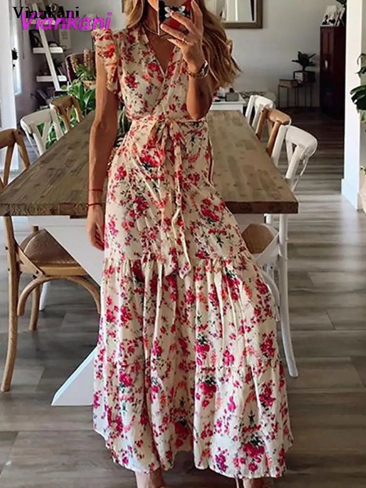 Длинное пляжное платье в стиле бохо с цветочным принтом и V-образным вырезом, Пляжная накидка на шнуровке с поясом и оборками, летняя пляжная...