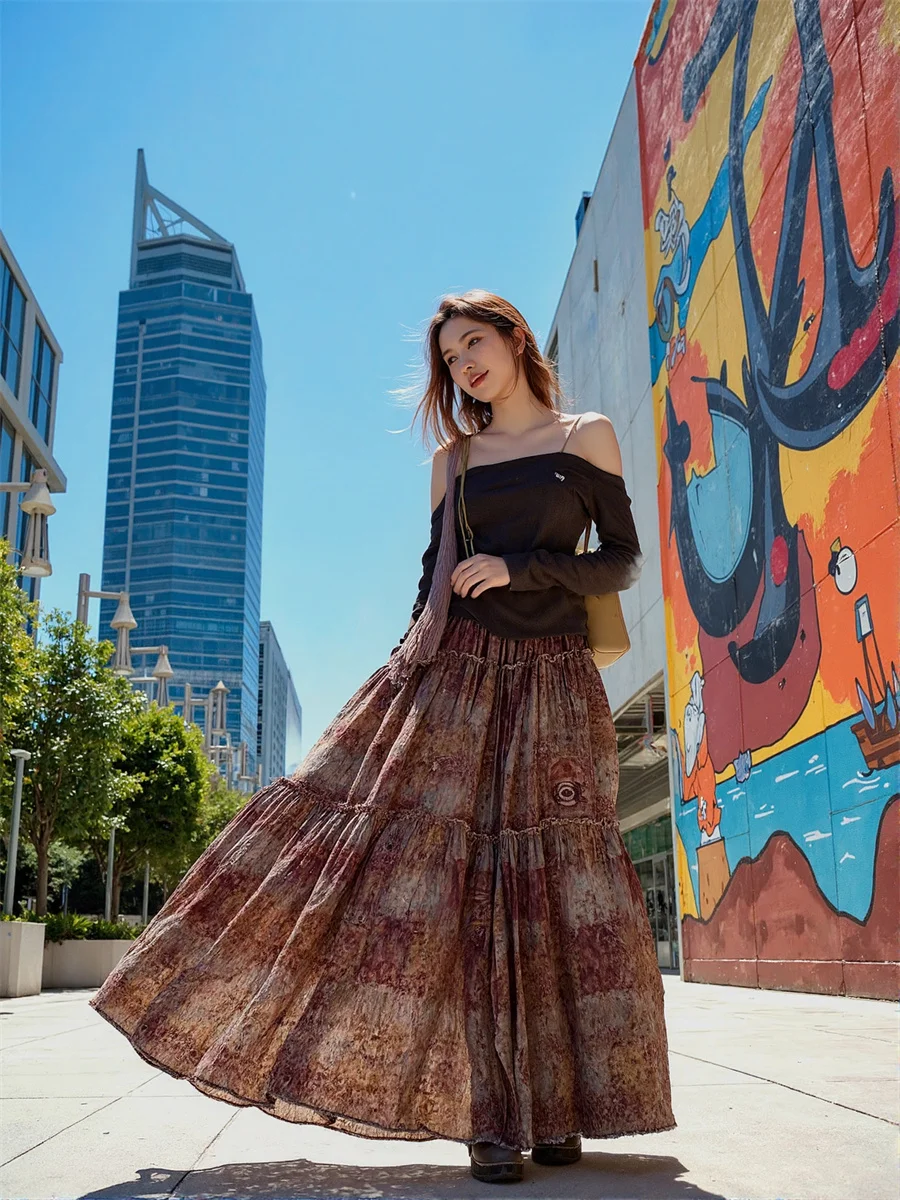 Длинные юбки с винтажным принтом, женские многослойные сетчатые плиссированные юбки с рюшами по подолу, элегантная эластичная летняя расклешенная юбка трапециевидной формы с высокой талией