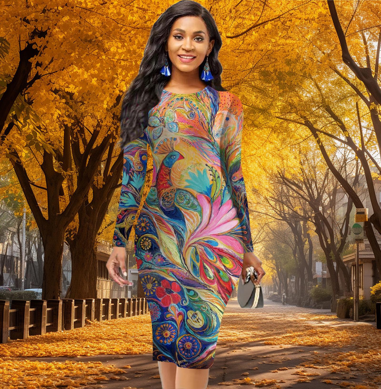 Длинный рукав, талия, облегающее офисное платье с принтом павлина, элегантное облегающее платье 8XL оранжевый