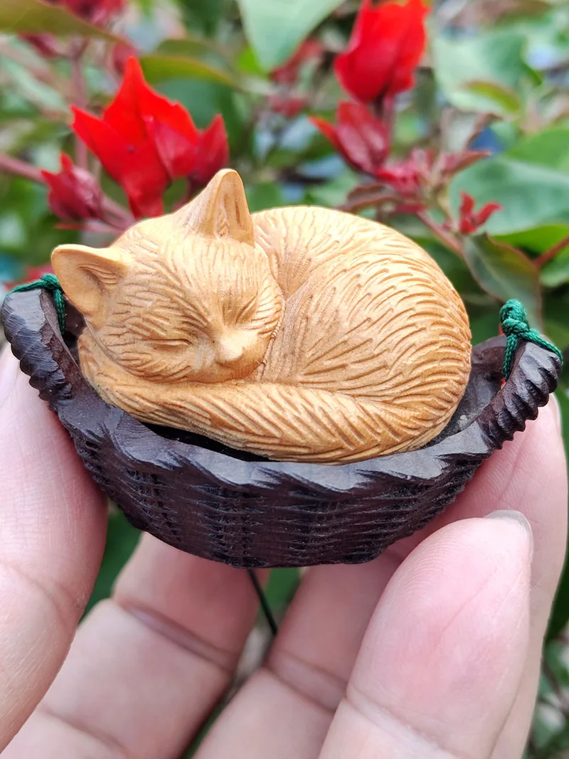 MZ016 - 2 " Hand Carved Boxwood Netsuke Carving Figurine - Lovely Cat in Basket