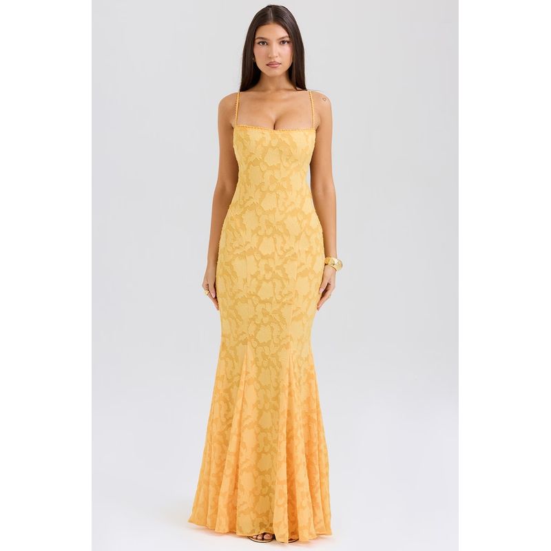Дом Тот же Стиль Сексуальная Элегантность Подчеркивающая Талию Поясная Лента Кружево Тисненый Жаккард Длинное Платье Русалка Платье Yellow embossed jacquard L