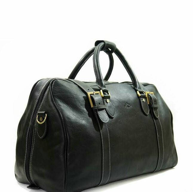 Дорожная кожаная сумка большая с двумя ручками на молнии прочная вместительная черная