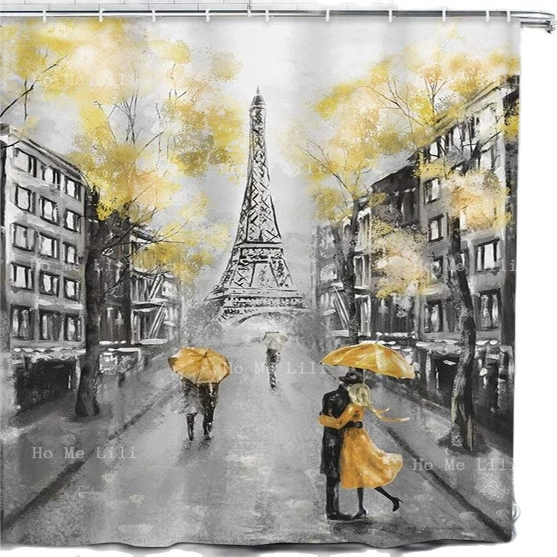 Душевая занавеска масляная живопись Париж Европейский городской пейзаж Франция Эйфелева башня черная белая и желтая Современная пара с крючками