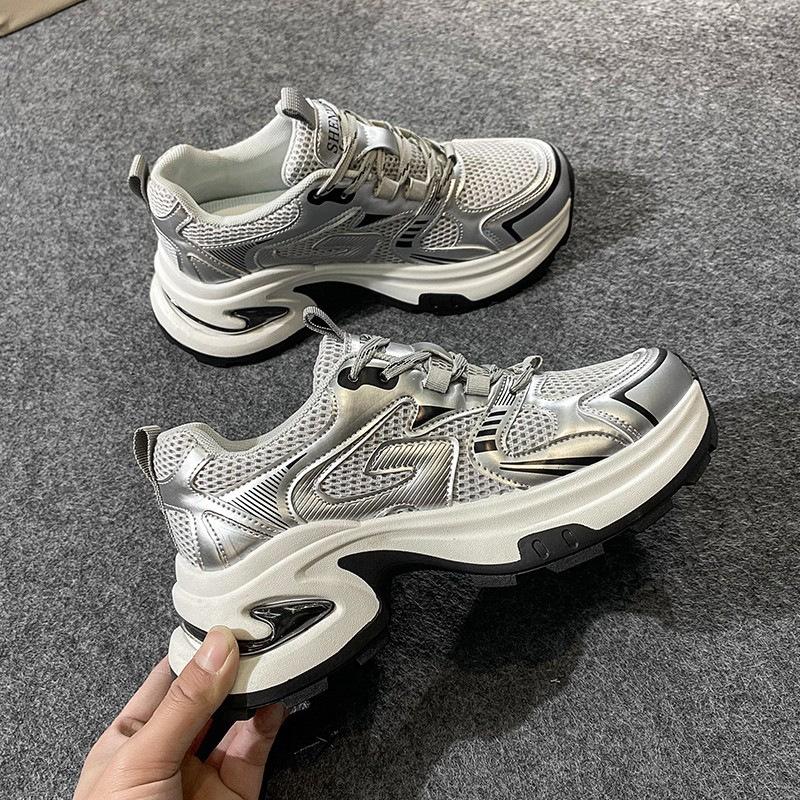 Дышащие сетчатые кроссовки на толстой подошве, женские, с небольшой прибавкой роста, для ношения с юбкой, новая повседневная спортивная обувь лето 2025 40 чёрный