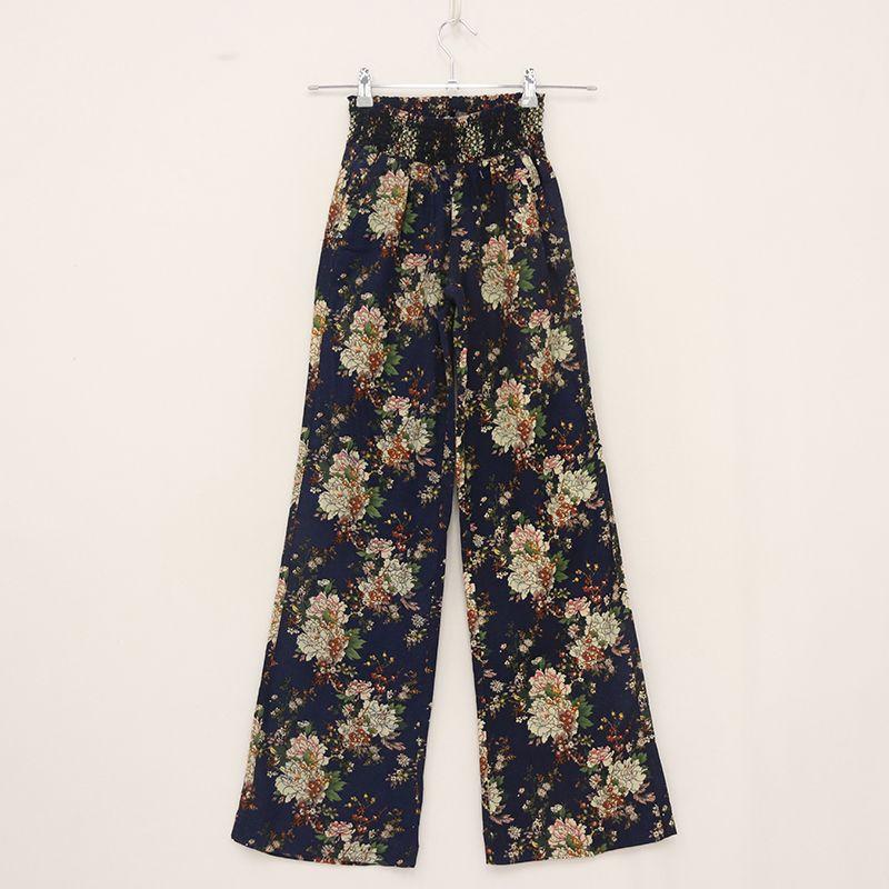 Европейская и американская внешняя торговля Женская одежда Легче всего сочетать Тонкие эластичные С высокой талией Многоцветные цветочные Широкие брюки из хлопка и льна Dark blue yellow flower M