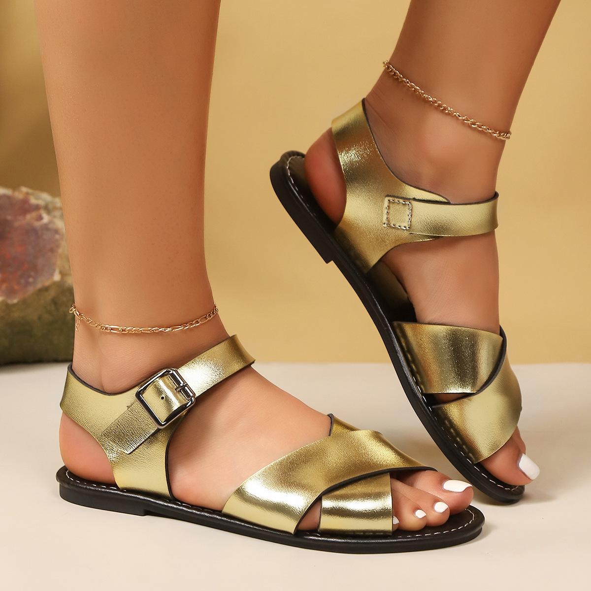 Европейская и американская внешняя торговля большой размер крест с плоскими сандалиями женские ретро стиль широкая полоса с открытым носком пляжные крутые шлепанцы сандалии 36 золотой