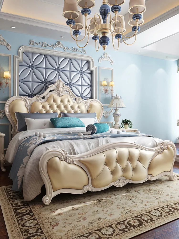 Европейская кровать для сада, кожаная кровать принцессы, французская роскошная мебель, Резная Кровать, синяя кровать для хранения, двойная кровать, свадебная кровать