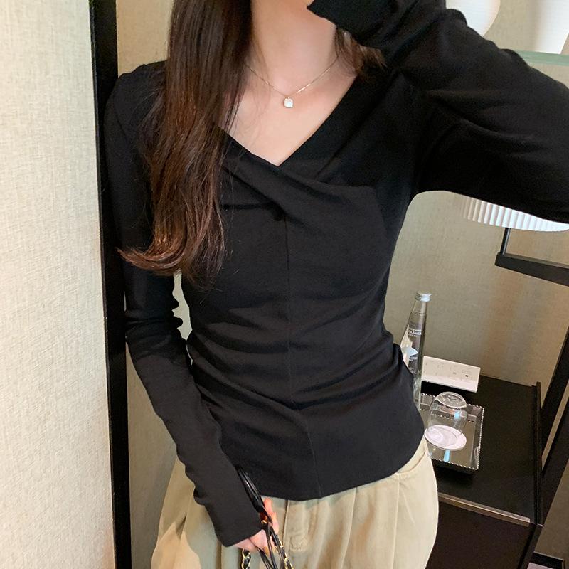 Европейская маленькая рубашка розовая футболка с крестом и V-образным вырезом женская осенне-зимняя новая универсальная шикарная тонкая майка с длинными рукавами XL
