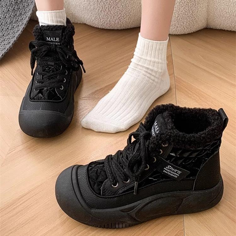 Европейская станция женские хлопковые туфли с бархатными теплыми короткими ботинками женские 2025 зима новые популярные хлопковые туфли овечья шерсть высокие туфли 40 чёрный