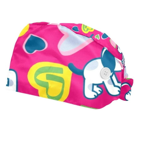 2PCS Working Cap with Buttons and Sweatband Adjustable Tie Back Hats Bouffant Caps Cute Dog Scrub Turban Hat