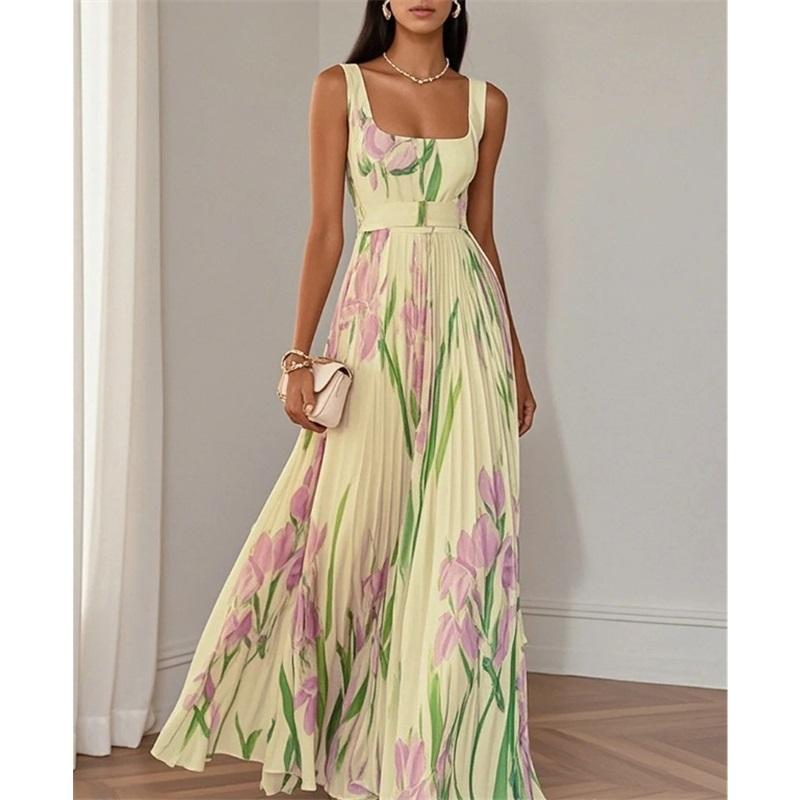 Европейский и американский стиль Элегантное вечернее платье Плиссированное платье с принтом Летнее новое платье без рукавов Длинное платье S