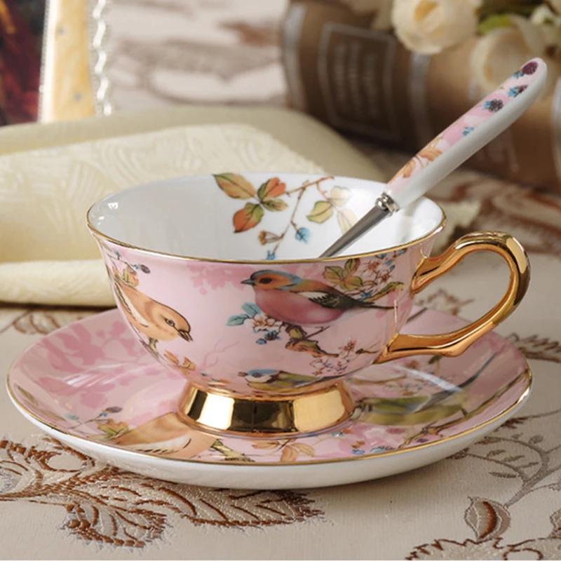 Европейский набор чашек для кофе с розовыми цветами и птицами, креативная керамическая чашка для чая из костяного фарфора с золотой каймой и блюдцем, с ложкой, красивый подарок розовый