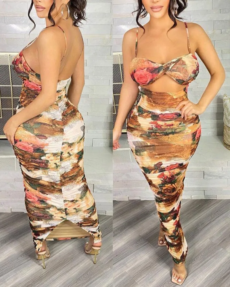 Floral Print Cutout Backless Ruched Cami Skinny Dress Women Summer 2021 New Sexy Maxi Dresses