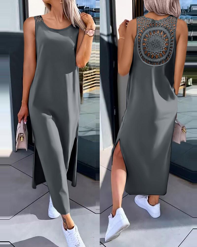 Европейское и американское женское летнее ажурное однотонное платье миди L темно-серого