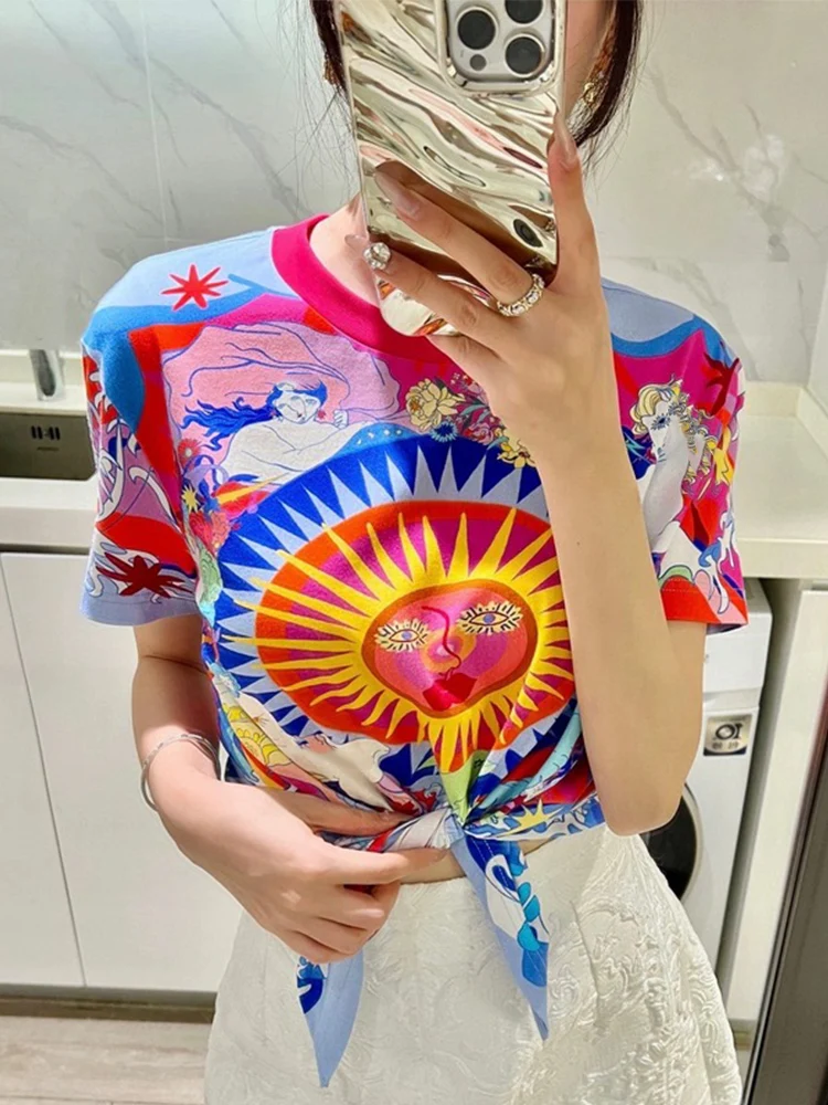 Fashion retro sun print design sense round neck short sleeve shirt Joker strap waist short T-shirt women's new