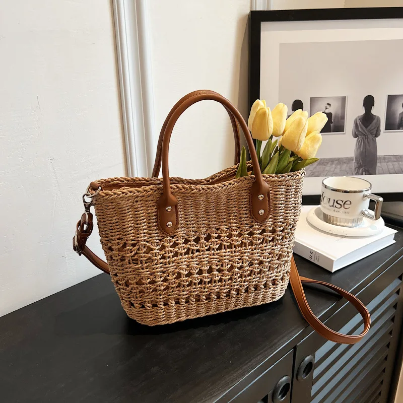 Женская Соломенная Сумка-тоут в стиле ретро, элегантная пляжная плетеная Сумочка для отдыха, повседневный тоут с ручками, модный клатч на плечо