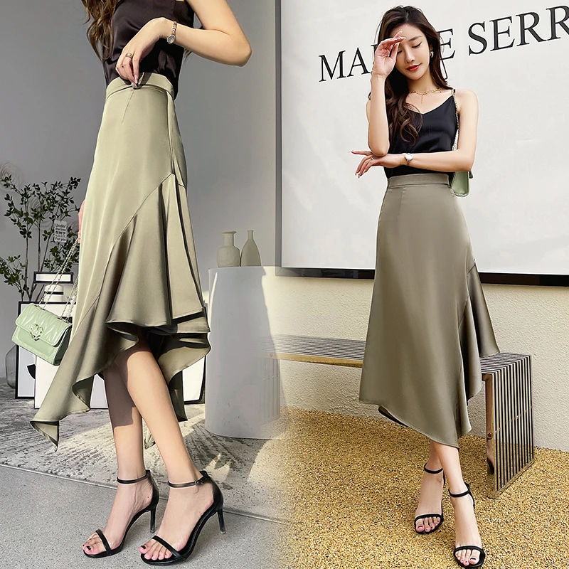 Женская атласная юбка миди TingYiLi, облегающая Асимметричная юбка с оборками по бокам, черная, розовая, зеленая юбка-годе в Корейском стиле на л...