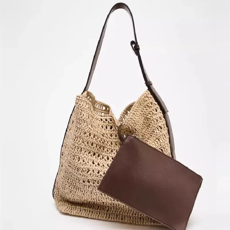 Женская богемная соломенная сумка на плечо, летняя пляжная тканая сумка подмышками, большая повседневная вязаная крючком сумка-тоут, сумки для покупок