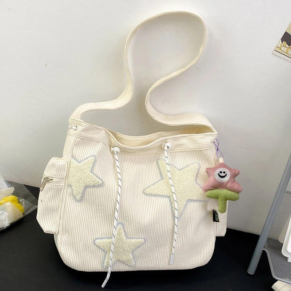 Женская вельветовая сумка через плечо со звездным узором, повседневная женская сумка-тоут, простая большая вместительная сумка на плечо для девочек, дорожная школьная сумка для книг, сумка белый