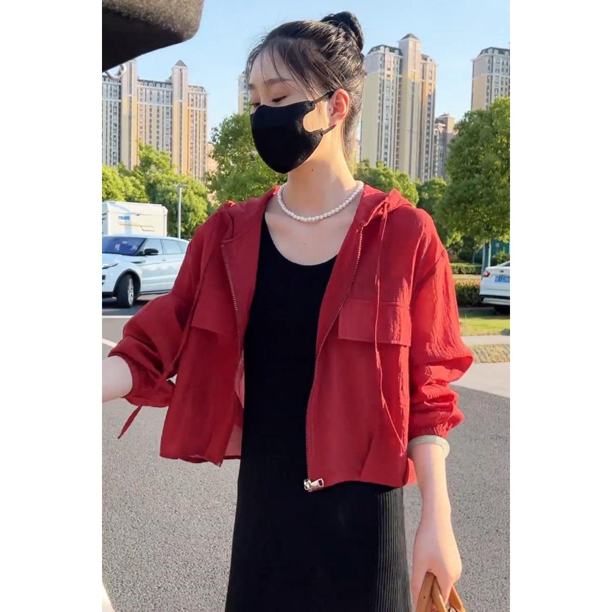 Женская высококачественная легкая куртка с капюшоном для защиты от солнца - Новый летний стиль 2025 года, Дышащая, Свободного кроя, Миниатюрная, Короткая. M (100-112 lbs) красный