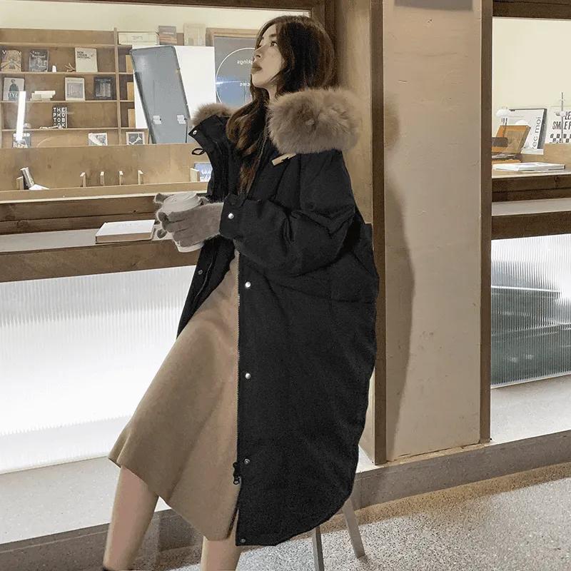 Женская длинная куртка-пуховик с зимним воротником из лисы, толстое пальто с капюшоном, роговые пуговицы, теплое шикарное зеленое пальто XS чёрный