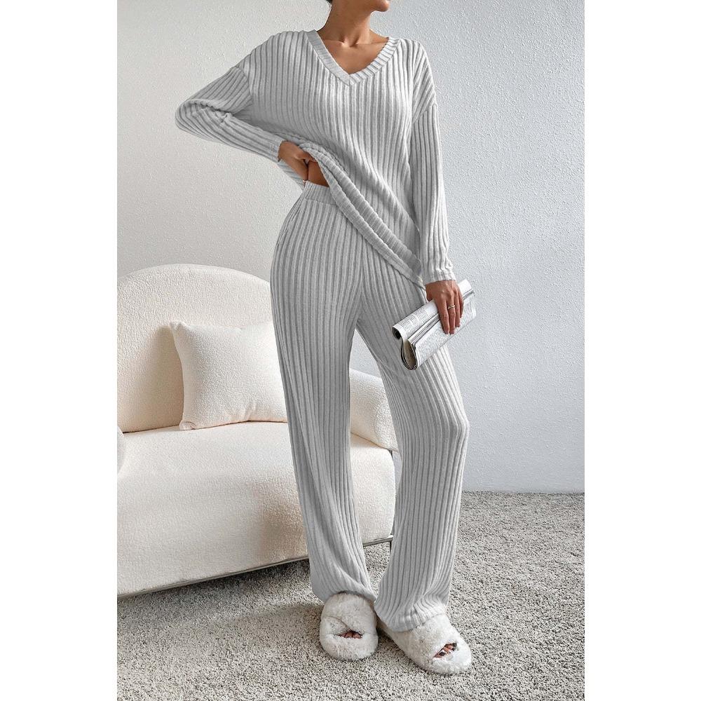 Женская домашняя одежда Осень и Зима Новая Мода Повседневные Прямые Брюки Свободный Трикотажный Костюм с V-образным Вырезом и Длинными Рукавами XXL серый