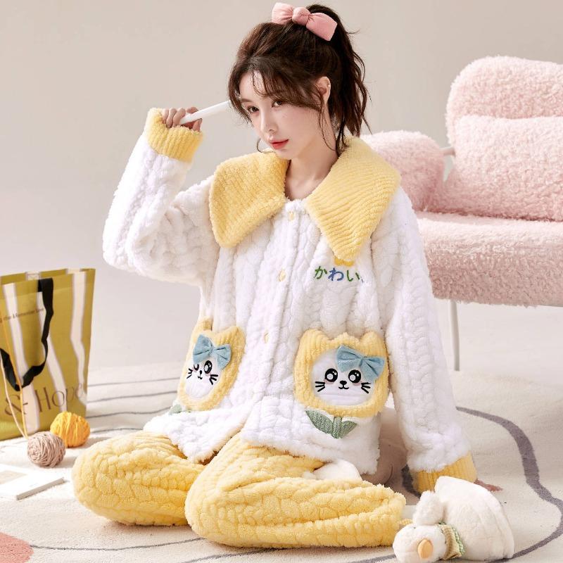Женская домашняя пижама, свободный большой размер, верхняя одежда, плюшевая утолщенная фланель, милый милый пижамный костюм для девочек из кораллового флиса 2XL жёлтый