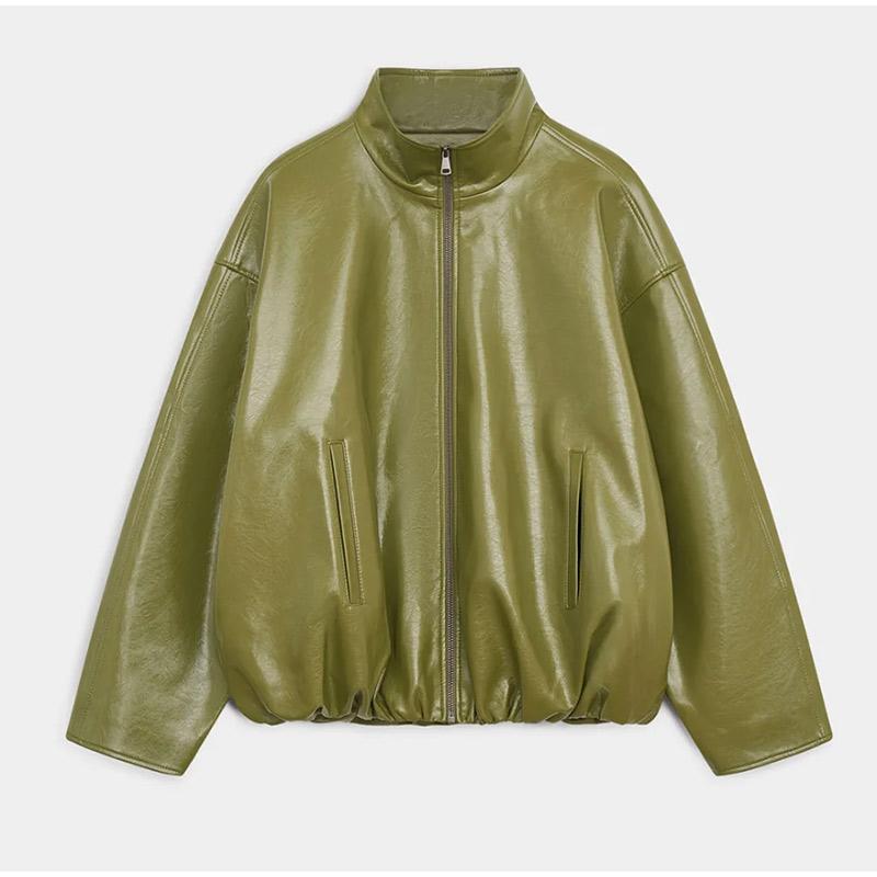Женская зеленая кожаная куртка со стойкой воротником, модная, на молнии, длинная, свободного кроя, верхняя одежда, шикарная, 2025, новая осенняя мода, уличный стиль, женская одежда M зелёный