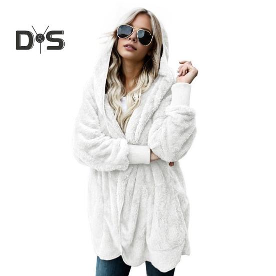 Женская зимняя куртка, двухсторонняя, плотный флис, с капюшоном и карманами, средней длины, однотонная, теплая, повседневная, длинное пальто L белый