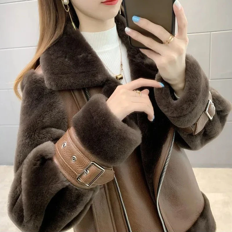 Женская зимняя куртка из овечьей шерсти, модель 2024 года, Модное теплое свободное короткое пальто в стиле пэчворк, мотоциклетная Женская верхняя одежда на молнии, топы