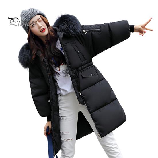 Женская зимняя куртка с меховым капюшоном, утолщенный пуховик, застежка-молния на шнурке, средняя длина, ветрозащитное хлопковое пальто для холодной погоды XL чёрный