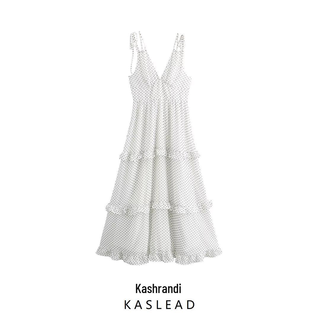 Женская зимняя мода 2024 года: Платье в европейском и американском стиле с оборками и бретелями в горошек L белый