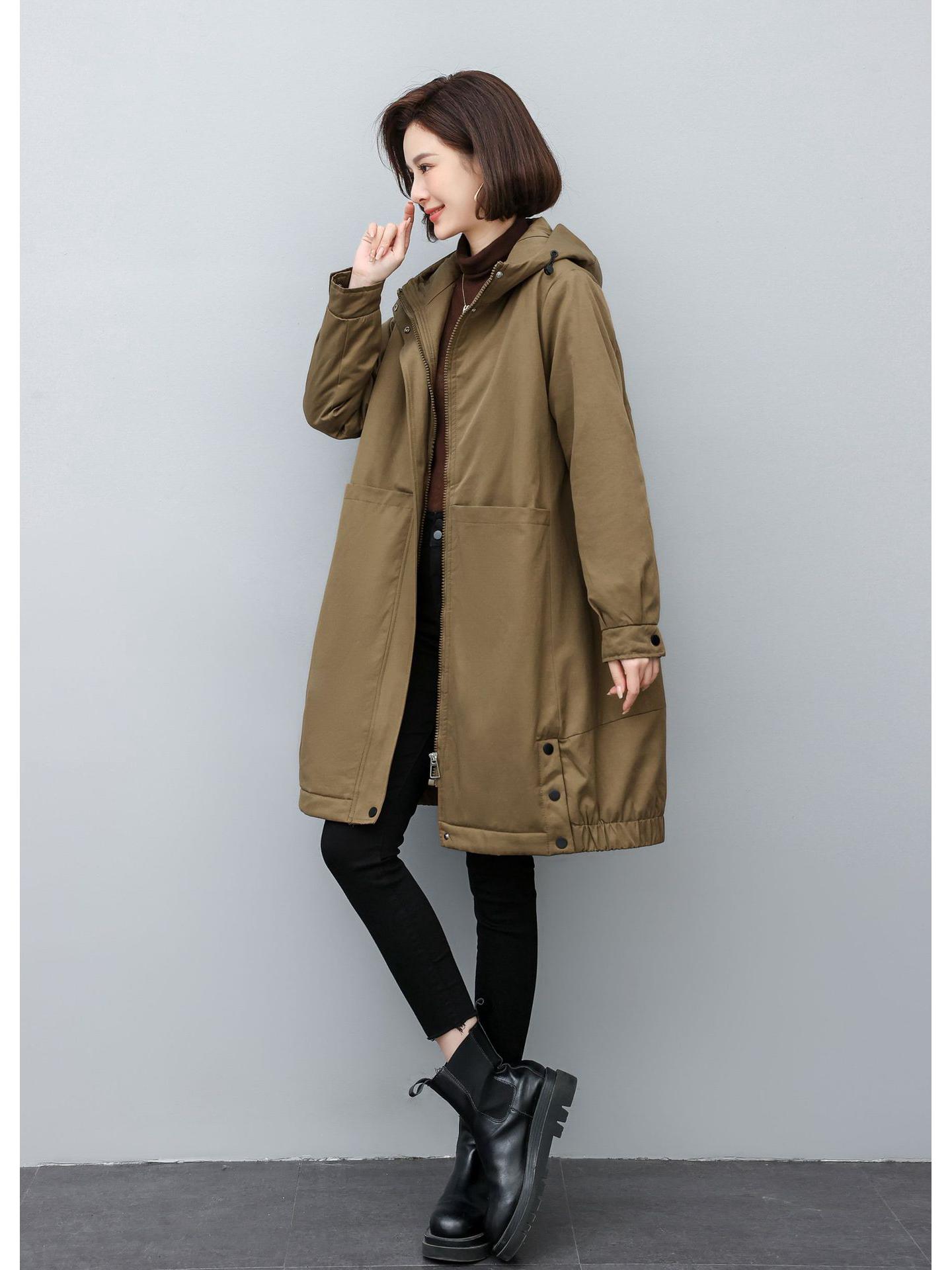 Женская зимняя парка с капюшоном на флисовой подкладке 2024: Свободное хлопковое пальто средней длины с утолщением, рабочая одежда M (95-118 jin) хаки