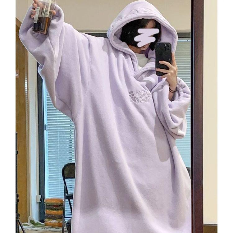 Женская зимняя теплая ночная сорочка большого размера, флисовый толстый ленивый халат с капюшоном, свободная оверсайз длинная ночная сорочка, ночная пижама XXXXL фиолетовый
