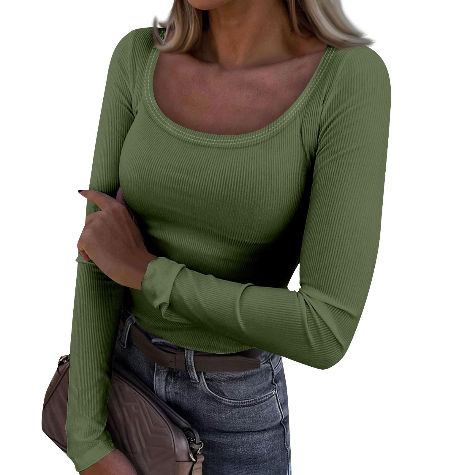Женская и зимняя футболка с тонким низом, модная повседневная однотонная футболка с U-образным вырезом, длинный рукав L армия зеленый