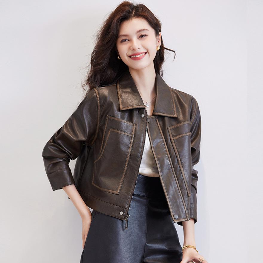 Женская короткая кожаная куртка с лацканами, весенняя новинка, универсальная, ретро, маленькая куртка для通勤, топ 2XL хаки