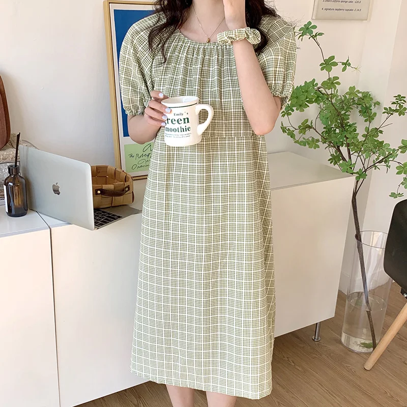 Женская летняя Клетчатая Пижама, Повседневная Свободная удобная домашняя одежда, эластичная ночная рубашка с коротким рукавом и круглым вырезом в стиле пэчворк, 6 цветов, D405