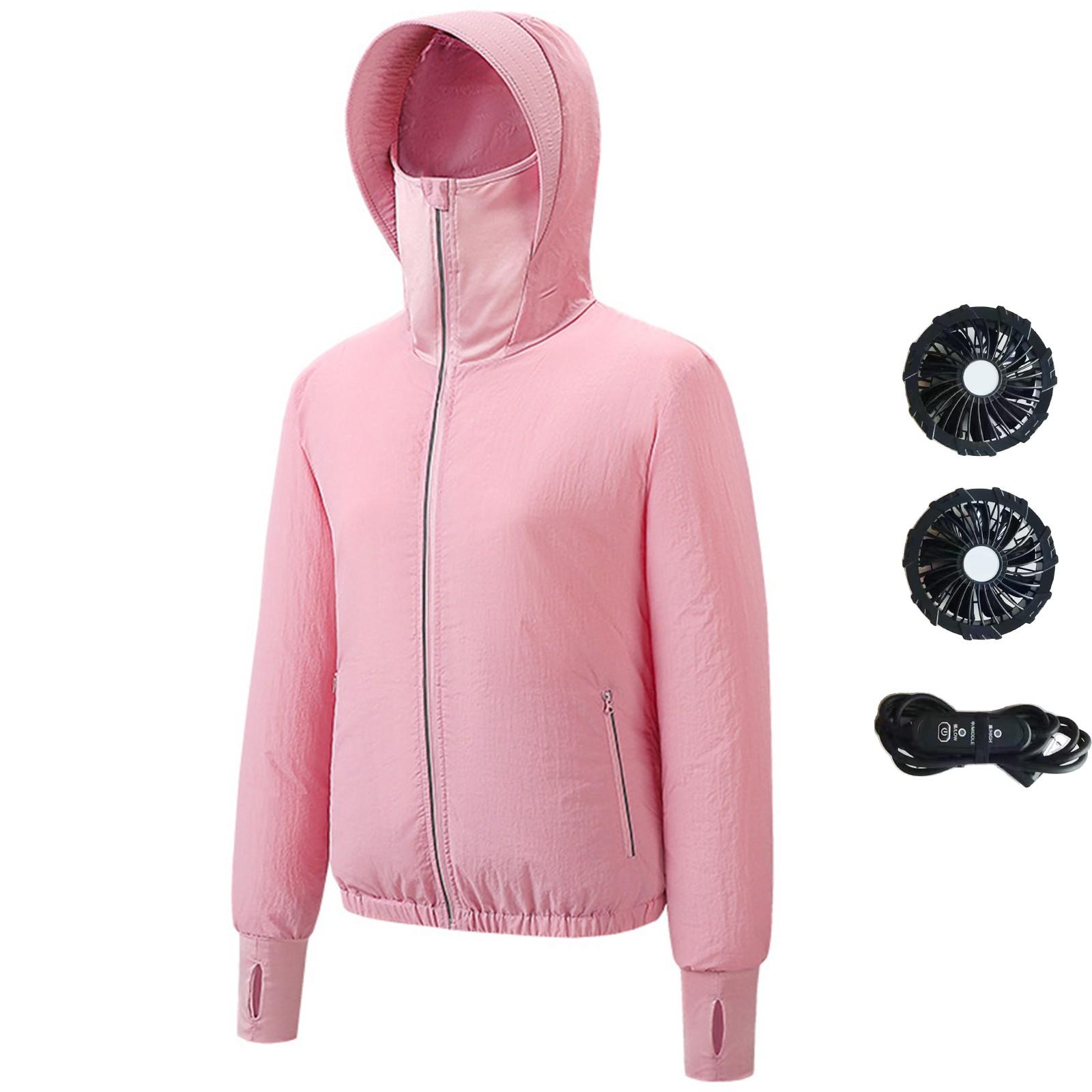 Женская летняя куртка с вентилятором (Включая набор 9-лопастных бесщеточных 5В вентиляторов) Рабочая одежда с длинным рукавом, капюшоном и молнией, защита от теплового удара, однотонная XXL розовый