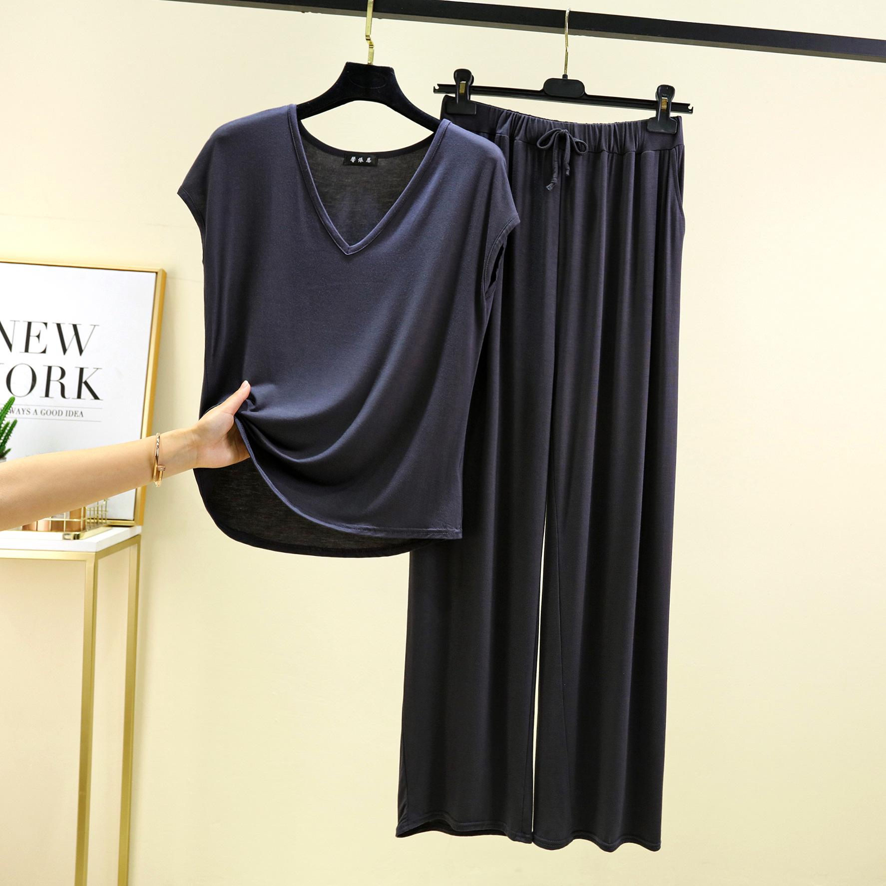 Женская летняя модальная домашняя одежда без рукавов с V-образным вырезом: Свободный, облегающий комплект из двух предметов: футболка и брюки XXL темно-серого