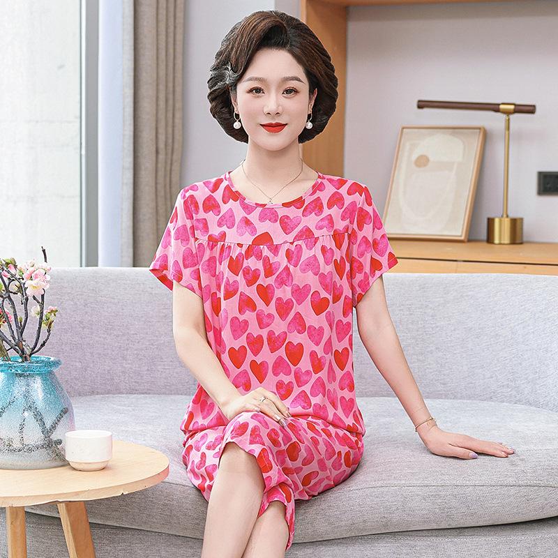 «Женская летняя пижама из хлопка и шелка»: Комплект из двух предметов с коротким рукавом, свободного кроя, для людей среднего и пожилого возраста, больших размеров, для ношения на открытом воздухе. XXXXL (80-90 kg)