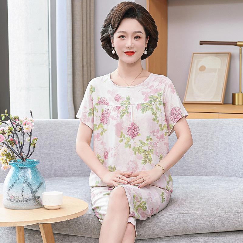 «Женская летняя пижама из хлопка и шелка»: Комплект из двух предметов с коротким рукавом, свободного кроя, для людей среднего и пожилого возраста, больших размеров, для ношения на открытом воздухе. XXXXL (80-90 kg)