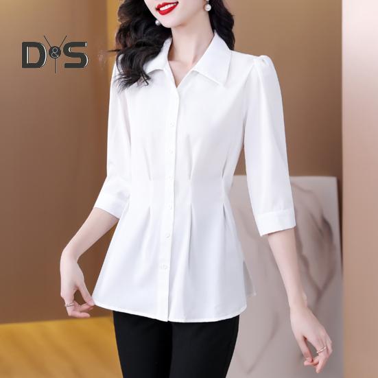 Женская летняя рубашка с лацканами, рукавом 3/4 на талии, узкая рубашка, топы, однотонная рабочая рубашка средней длины с рюшами на подоле, рабочая одежда XL белый