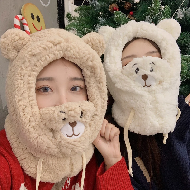 Женская маска из искусственного овечьего меха, шапка, мультяшный медведь, однотонная женская шапочка, теплая зимняя уличная шапка, милая ку...
