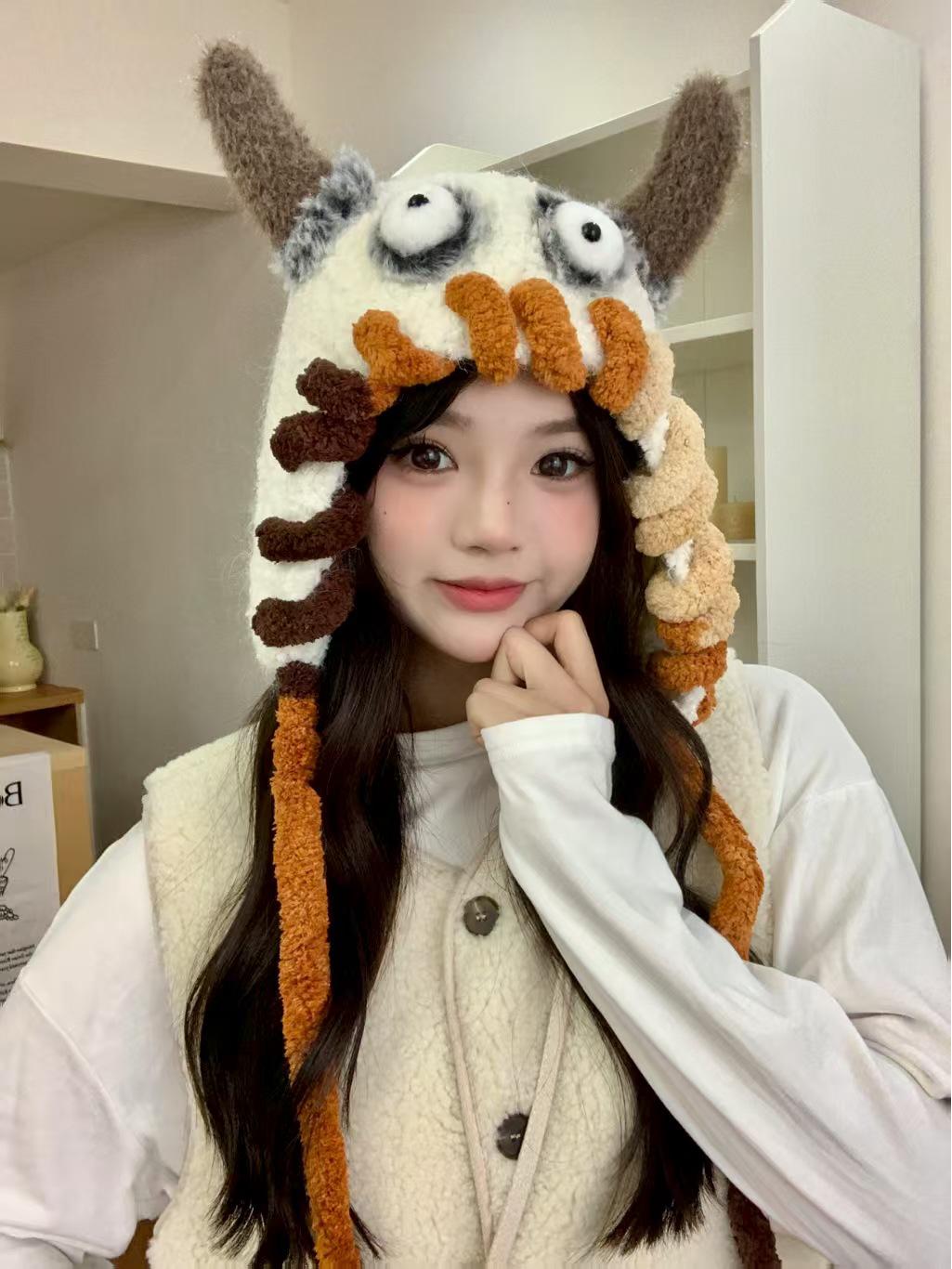 Женская милая шерстяная шапка-ушанка с ушками маленького монстра - Смешная, теплая и вязаная для осени/зимы. M (56-58cm) белый