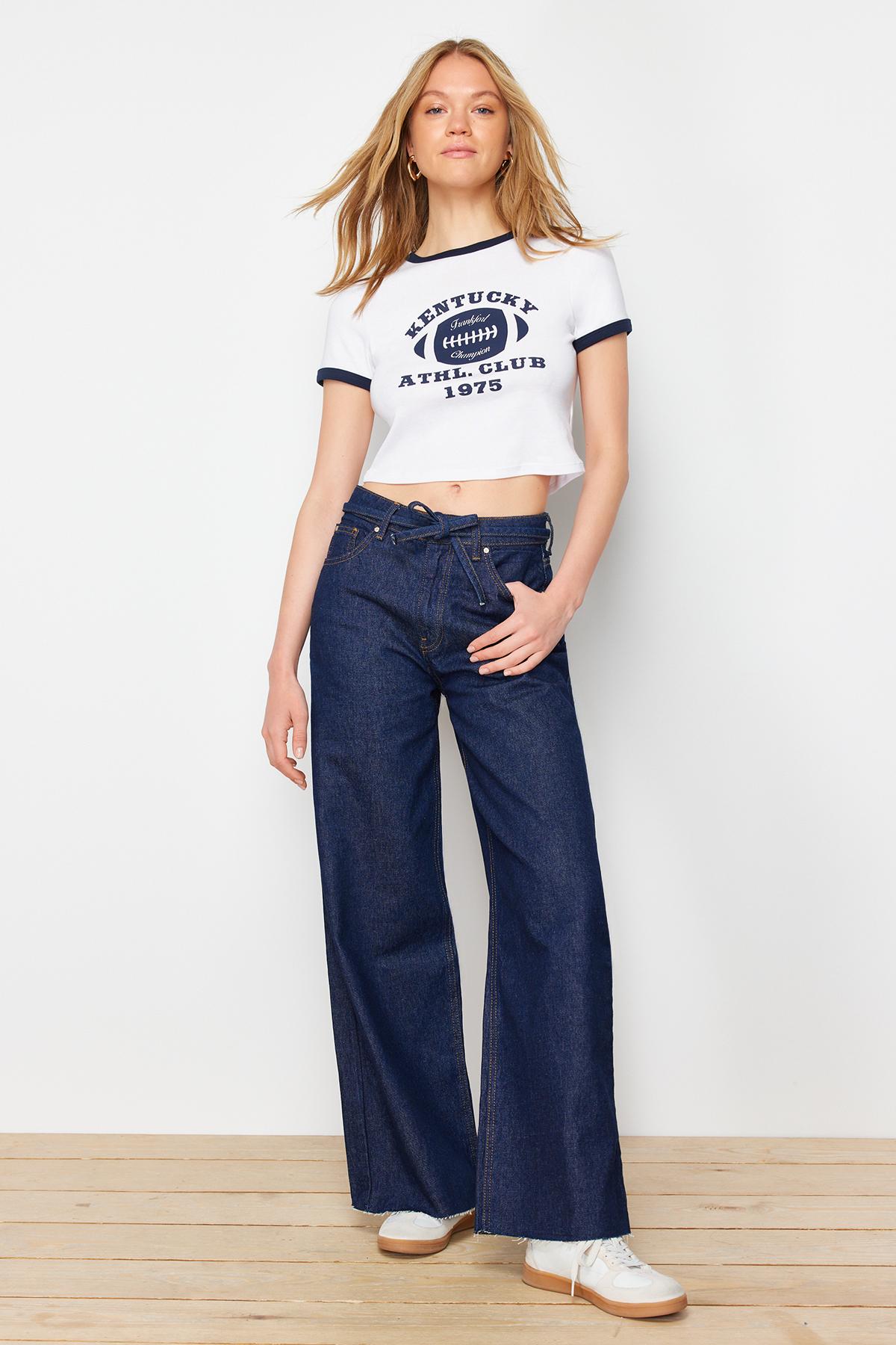 Женская мода Новые джинсы Темно-синие Более экологичные широкие джинсы с высокой талией и деталями на талии