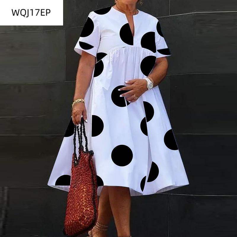 Женская мода плюс размер круглый вырез короткий рукав горошек платье 3XL чёрный