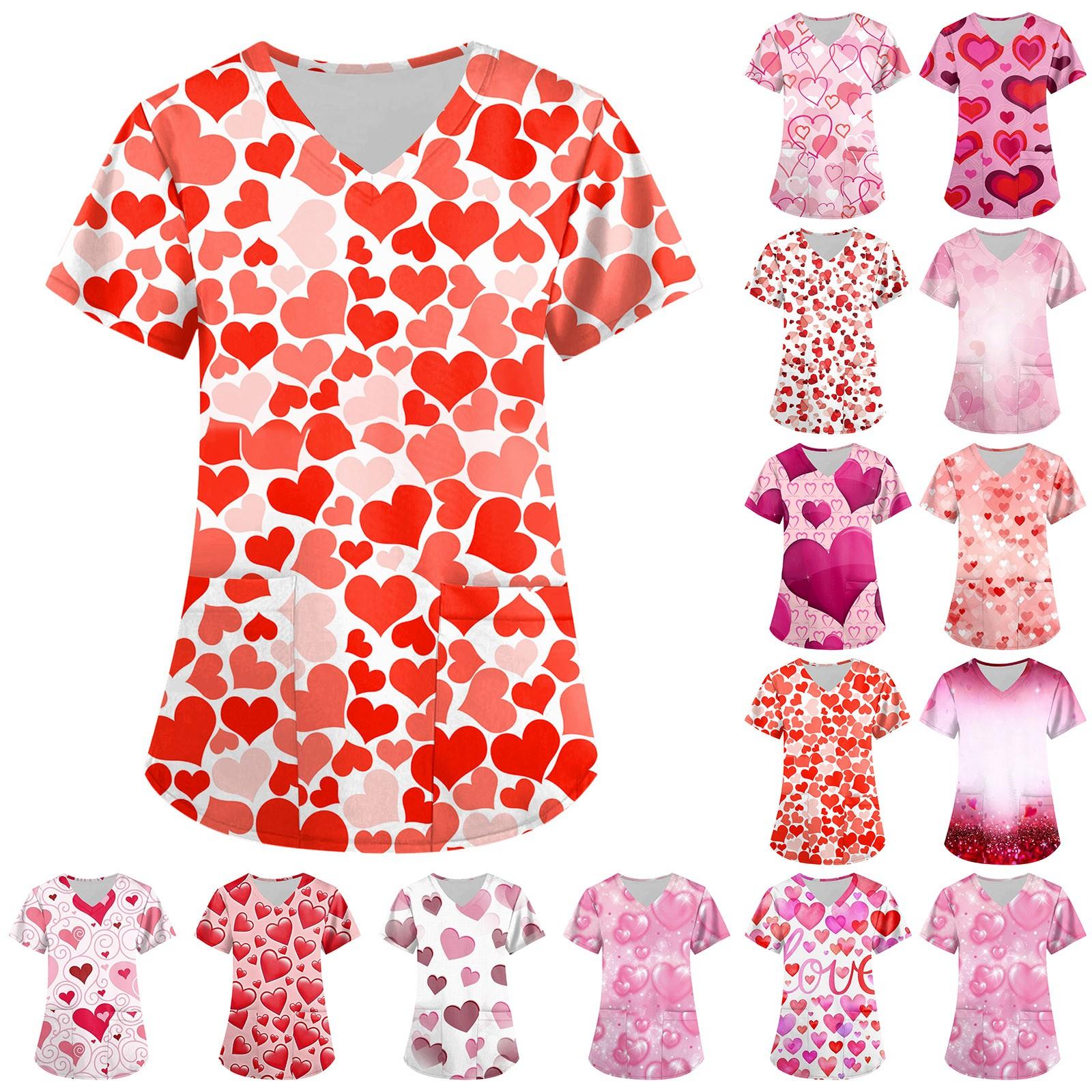 Женская мода, рабочая одежда с v-образным вырезом, короткими рукавами и карманами, топы с принтом ко Дню святого Валентина