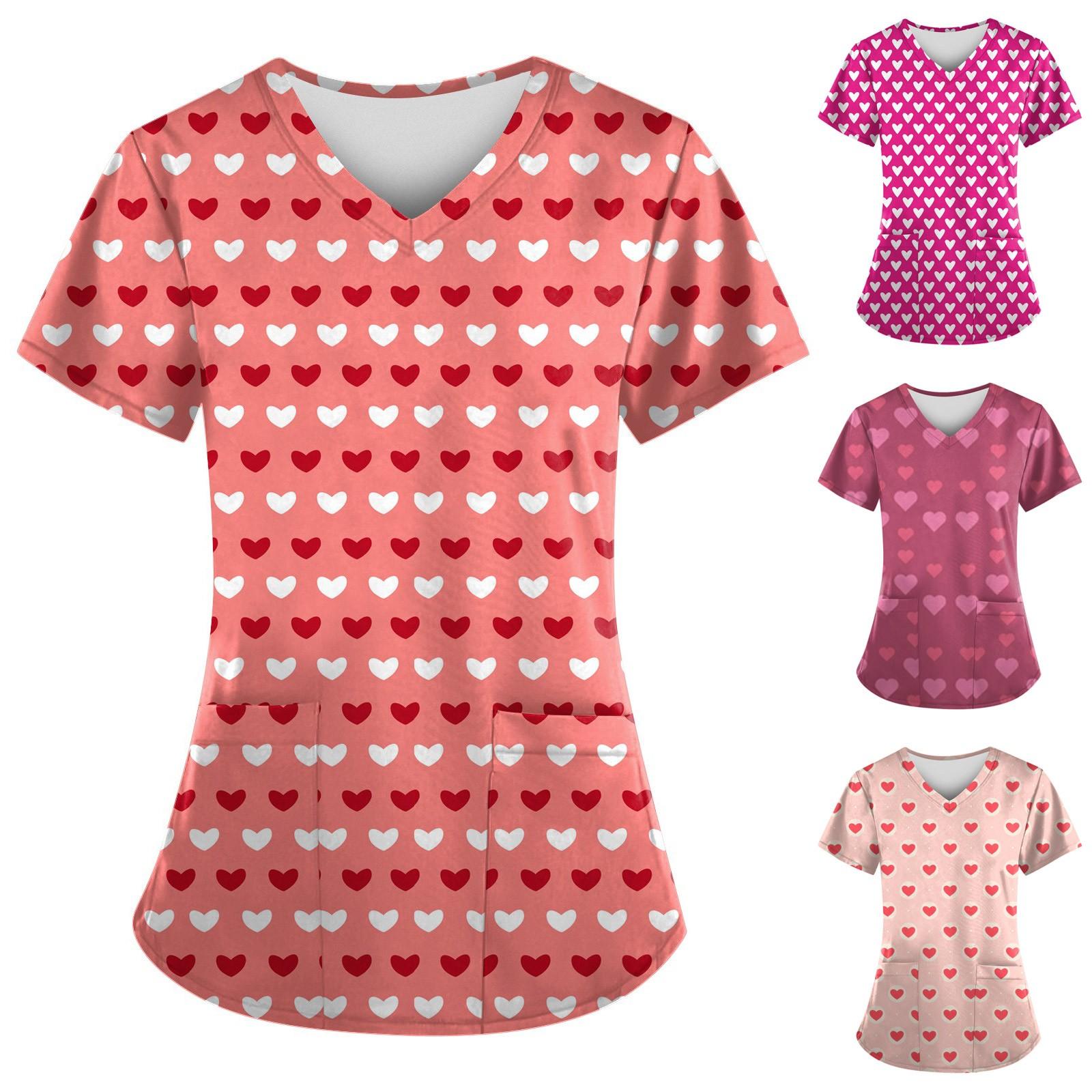 Женская мода, рабочая одежда с v-образным вырезом и короткими рукавами с принтом ко Дню святого Валентина и топы с карманами