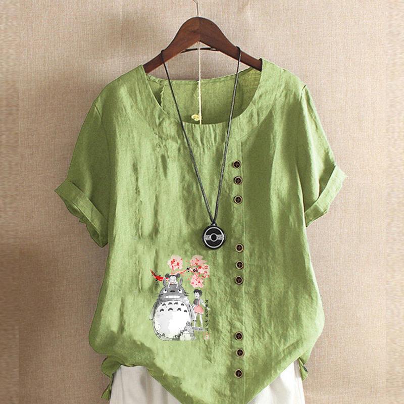 Женская мода, футболка с коротким рукавом и круглым вырезом, повседневная хлопково-льняная рубашка с рисунком, свободная летняя блузка с героями мультфильмов для отдыха, топы 5XL зелёный